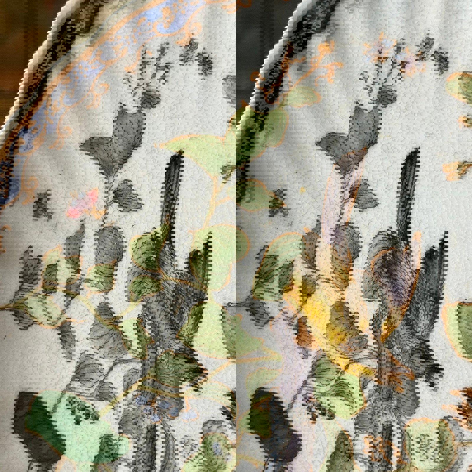 Hand-colored or transfer-printed birds, butterflies, and foliage with cobalt blue and gold rim accents