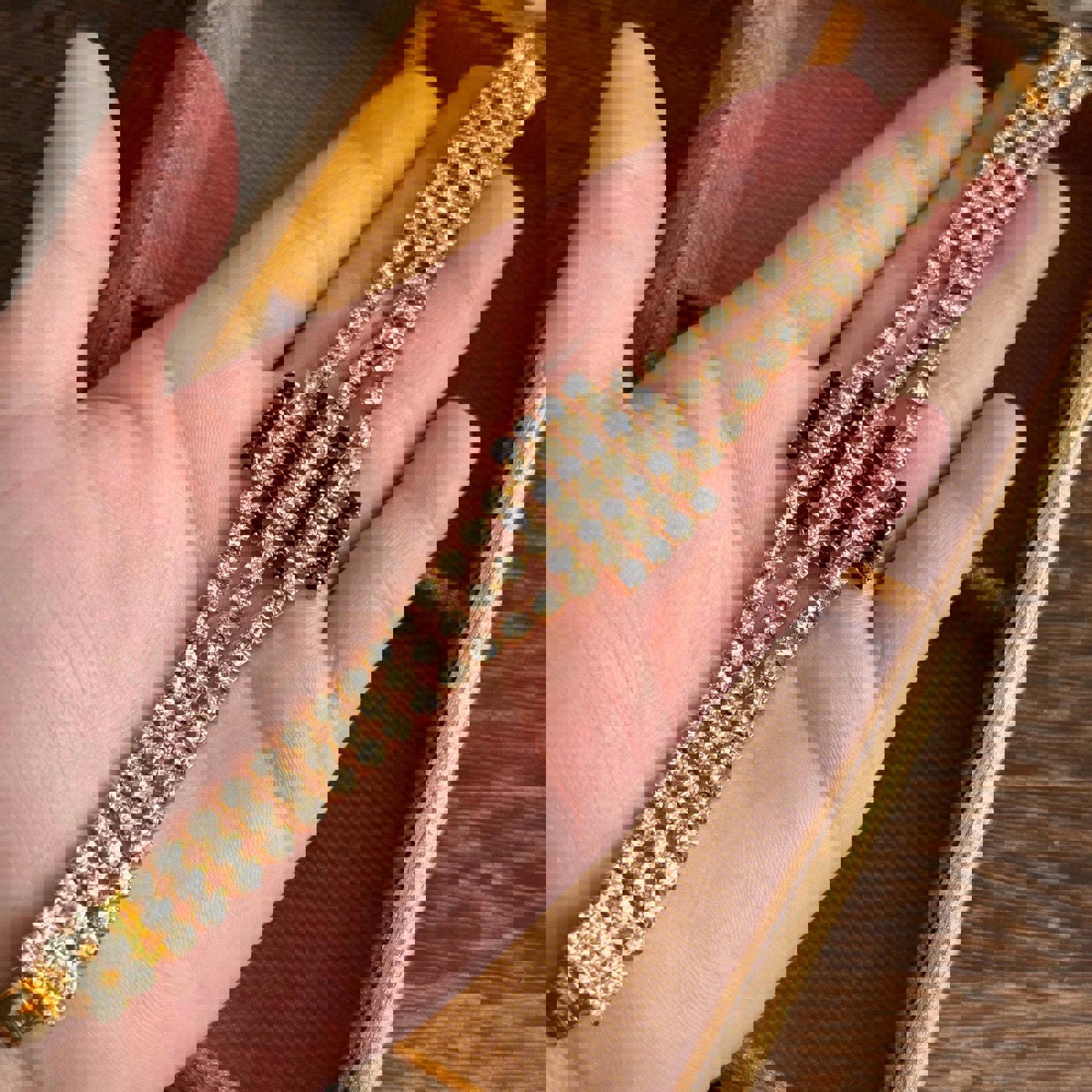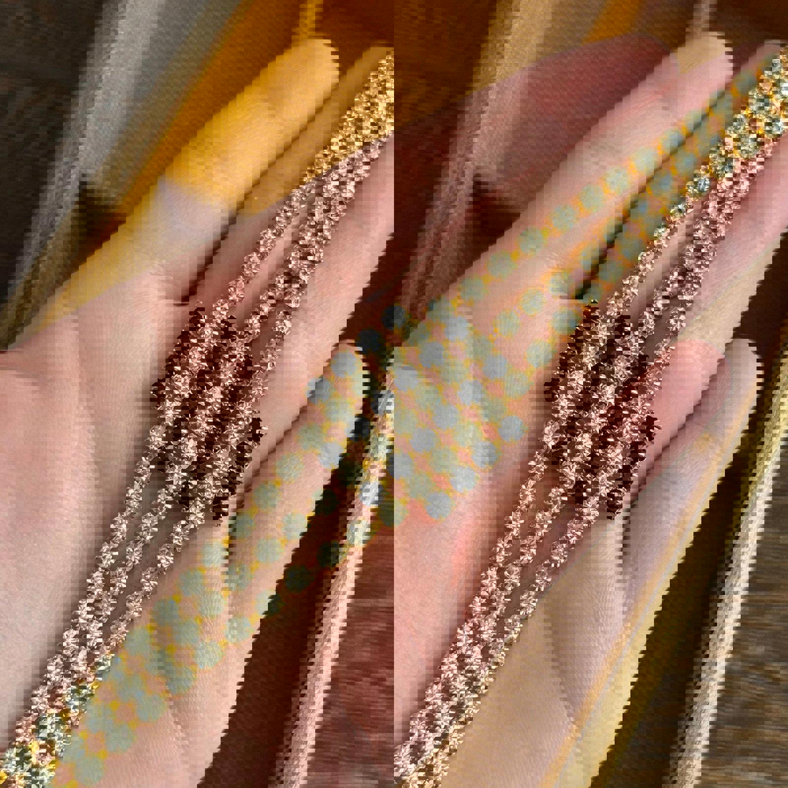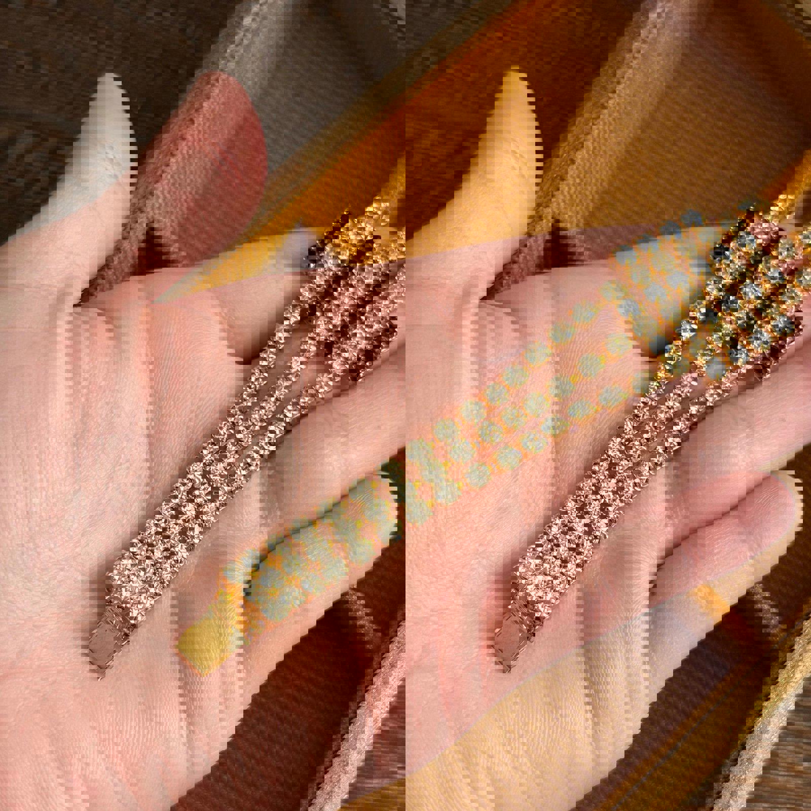 Gold-tone metal base with three rows of clear rhinestones bracelet