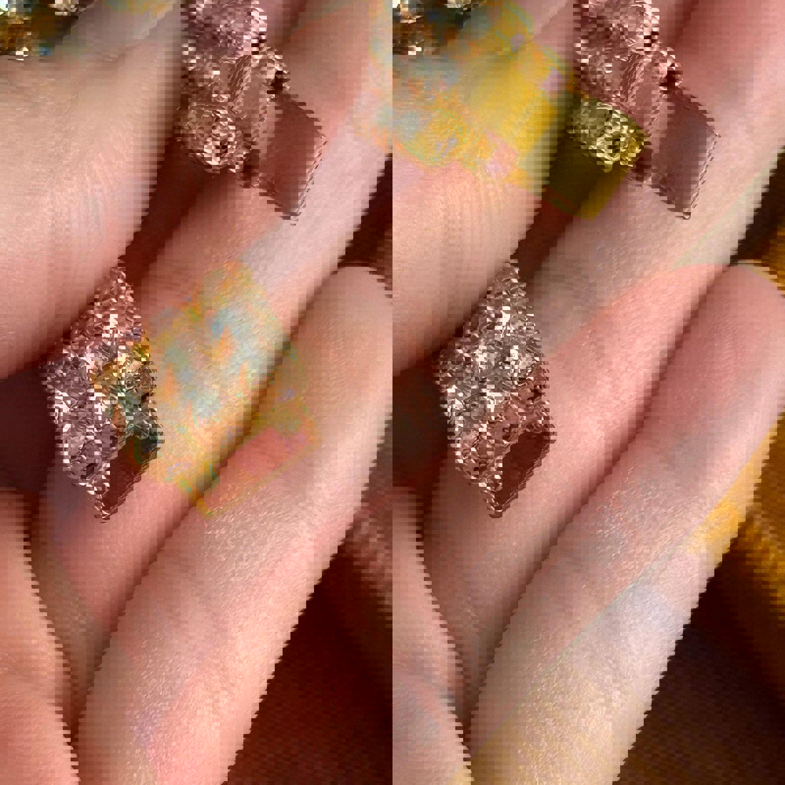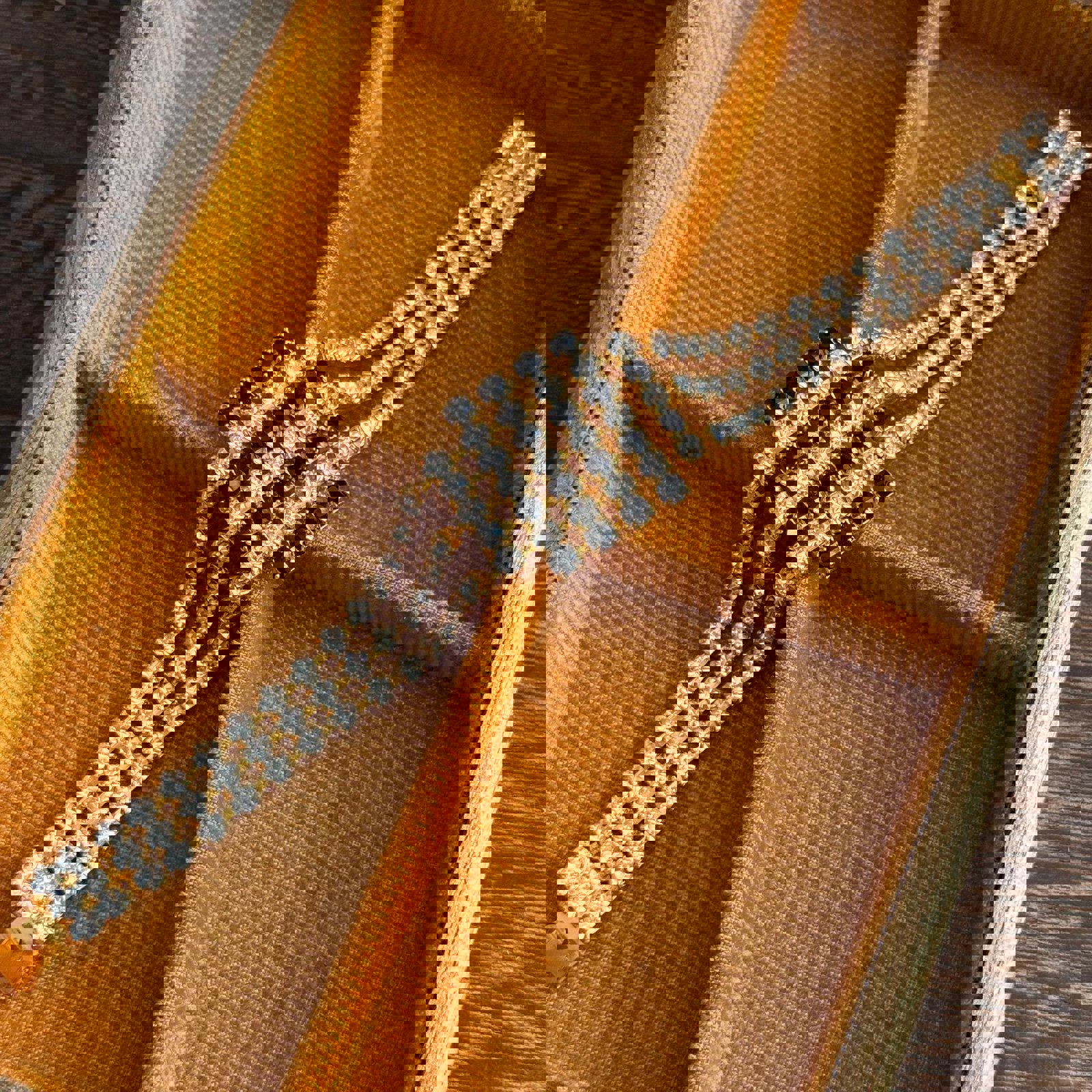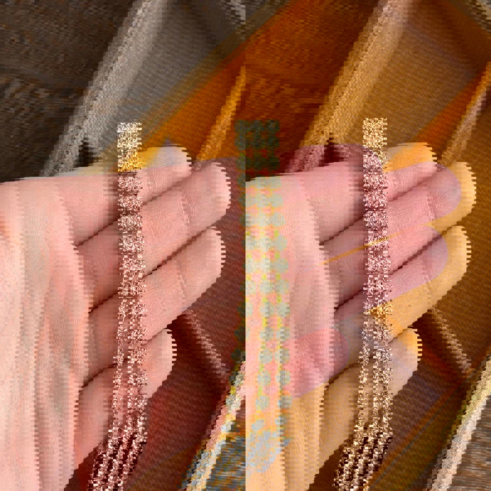 Gold-tone metal base with three rows of clear rhinestones bracelet