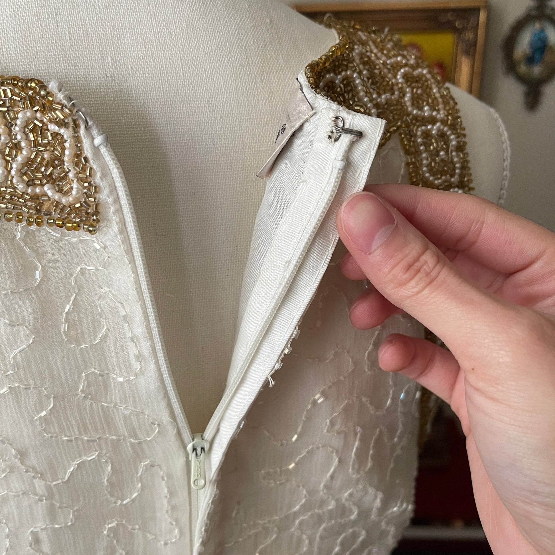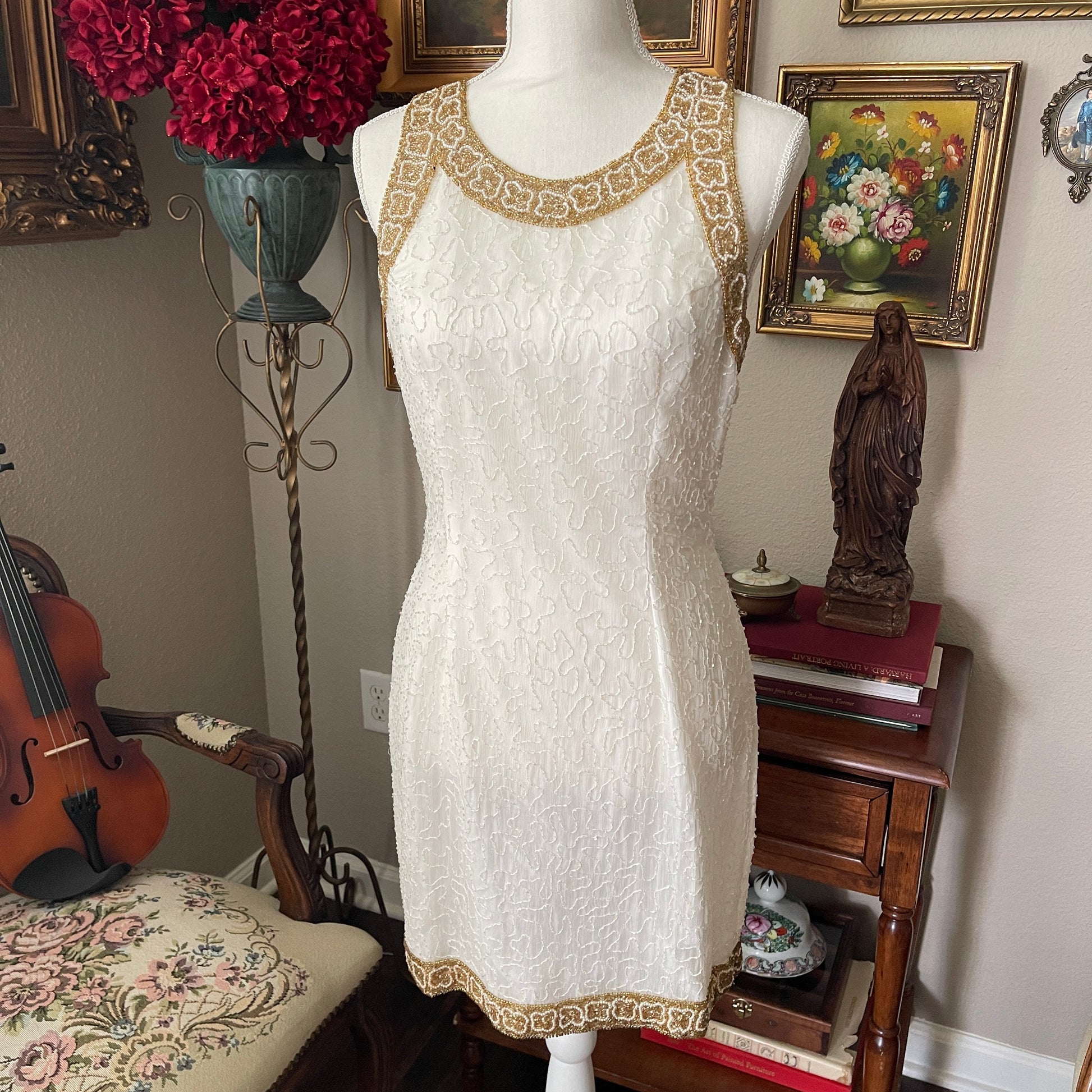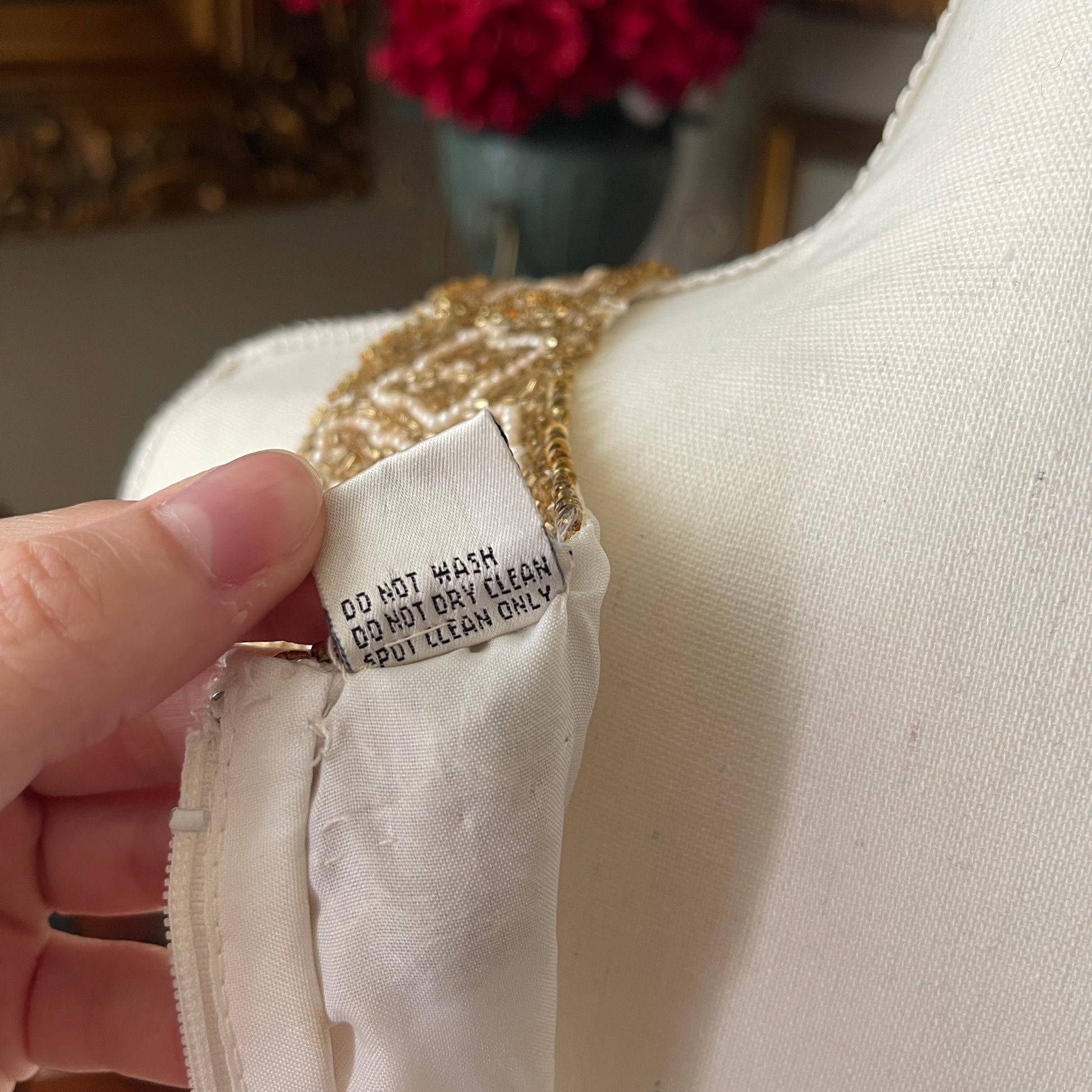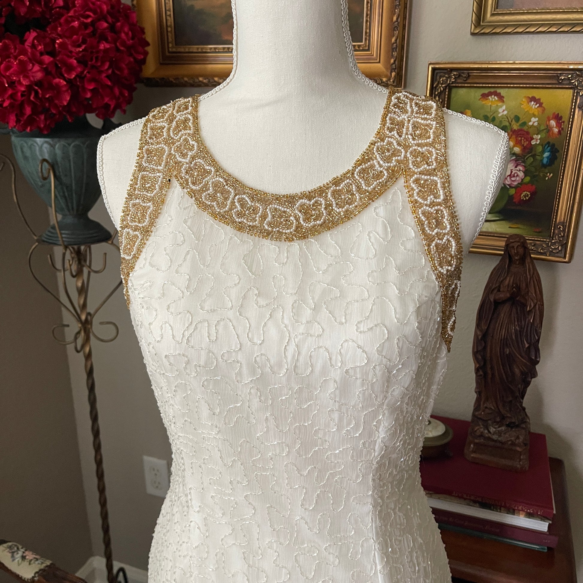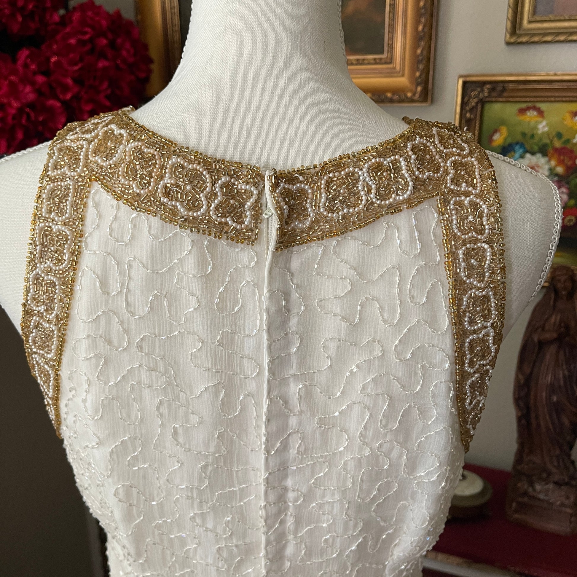 Laurence Kazar Vintage 80s White & Gold Beaded Dress