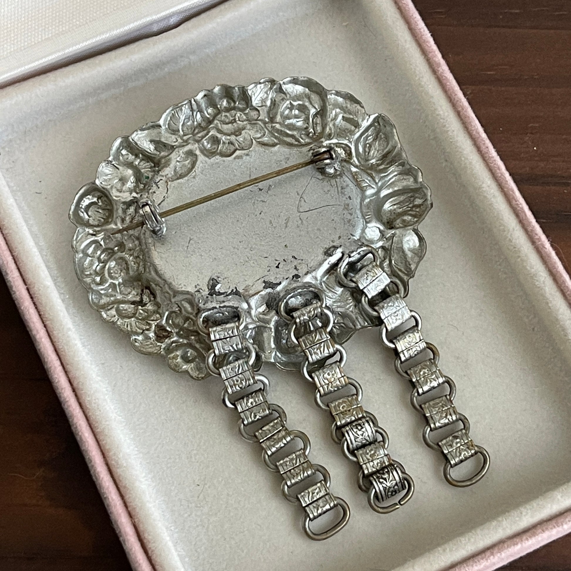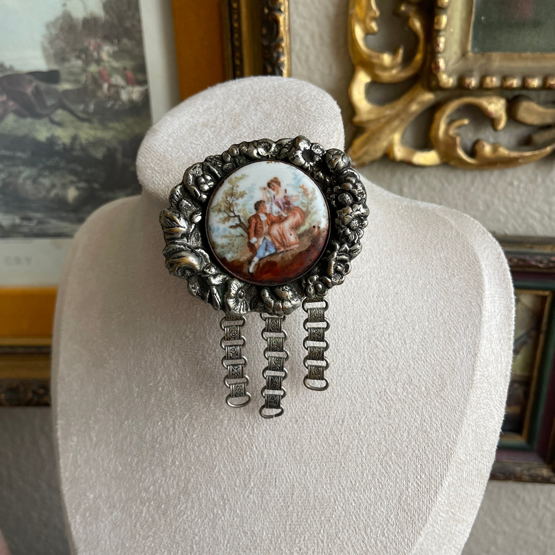 Unique porcelain courting couple scenery silver tone dangle brooch