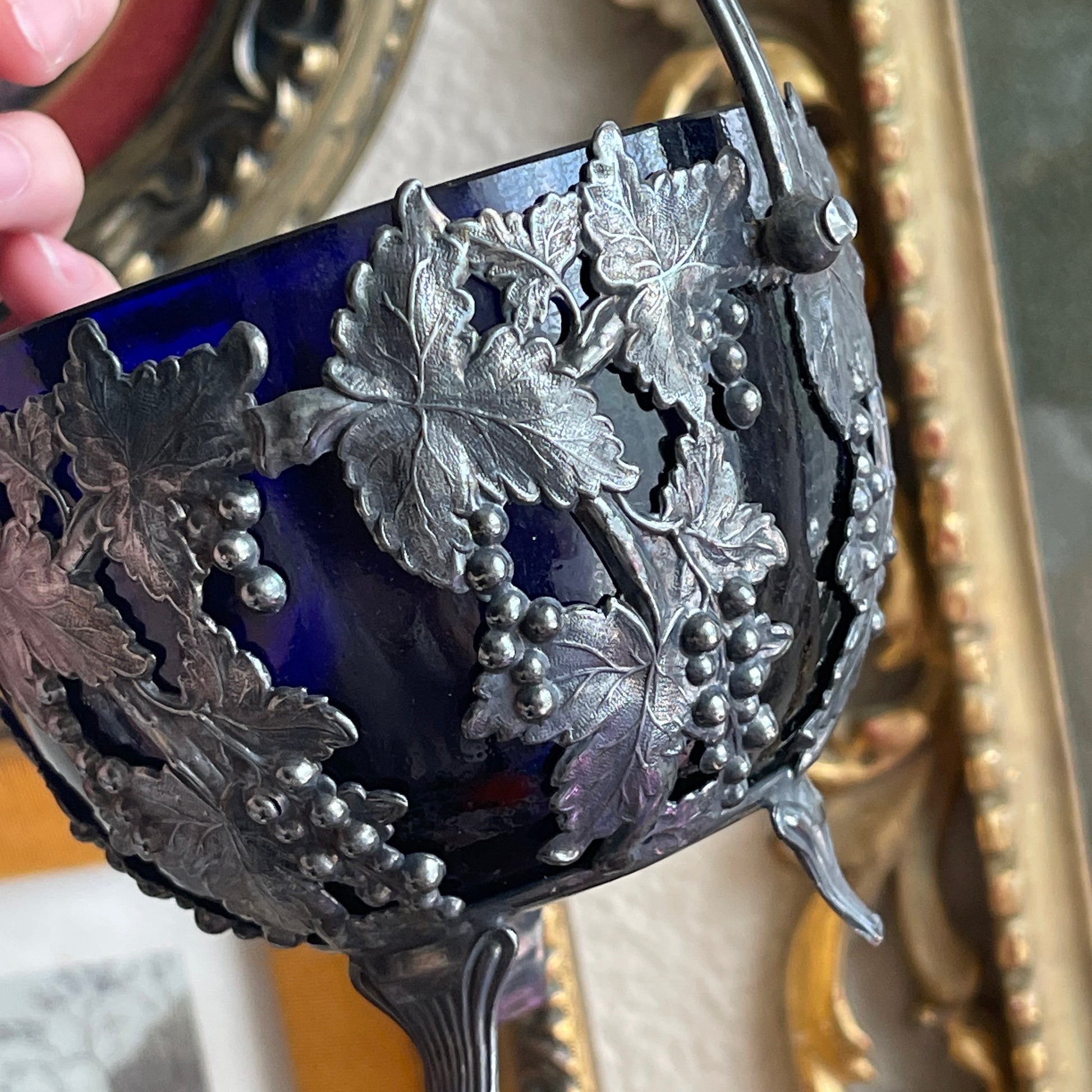 Vintage 1920's Silver Plated Bowl Basket with Cobalt Blue Glass Insert