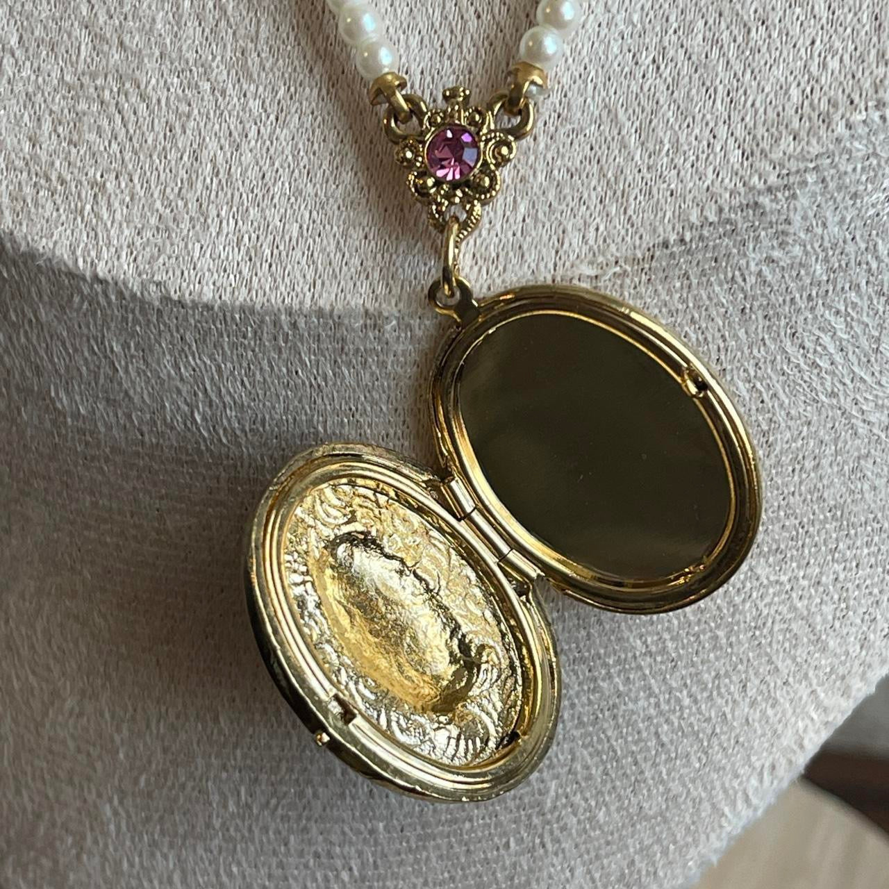 Vintage 1928 pearl necklace with locket with pink rhinestone