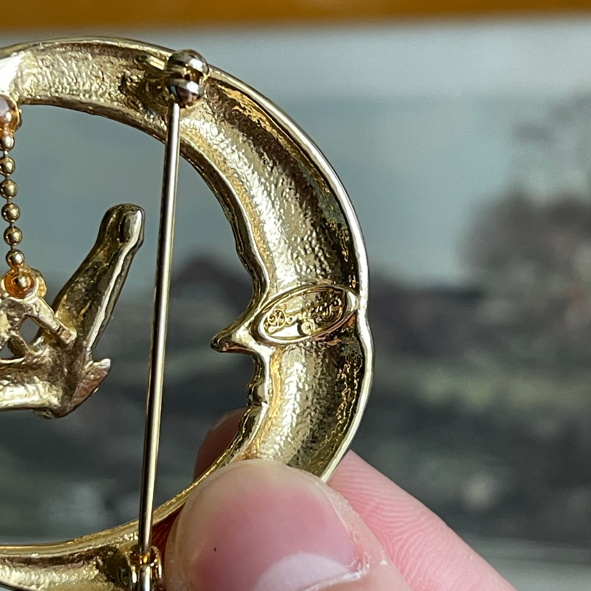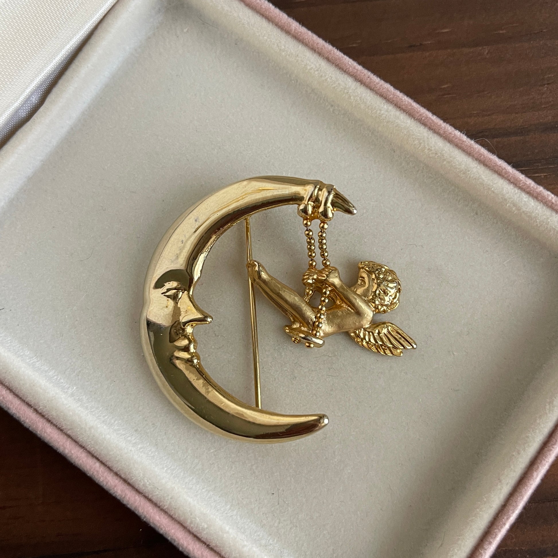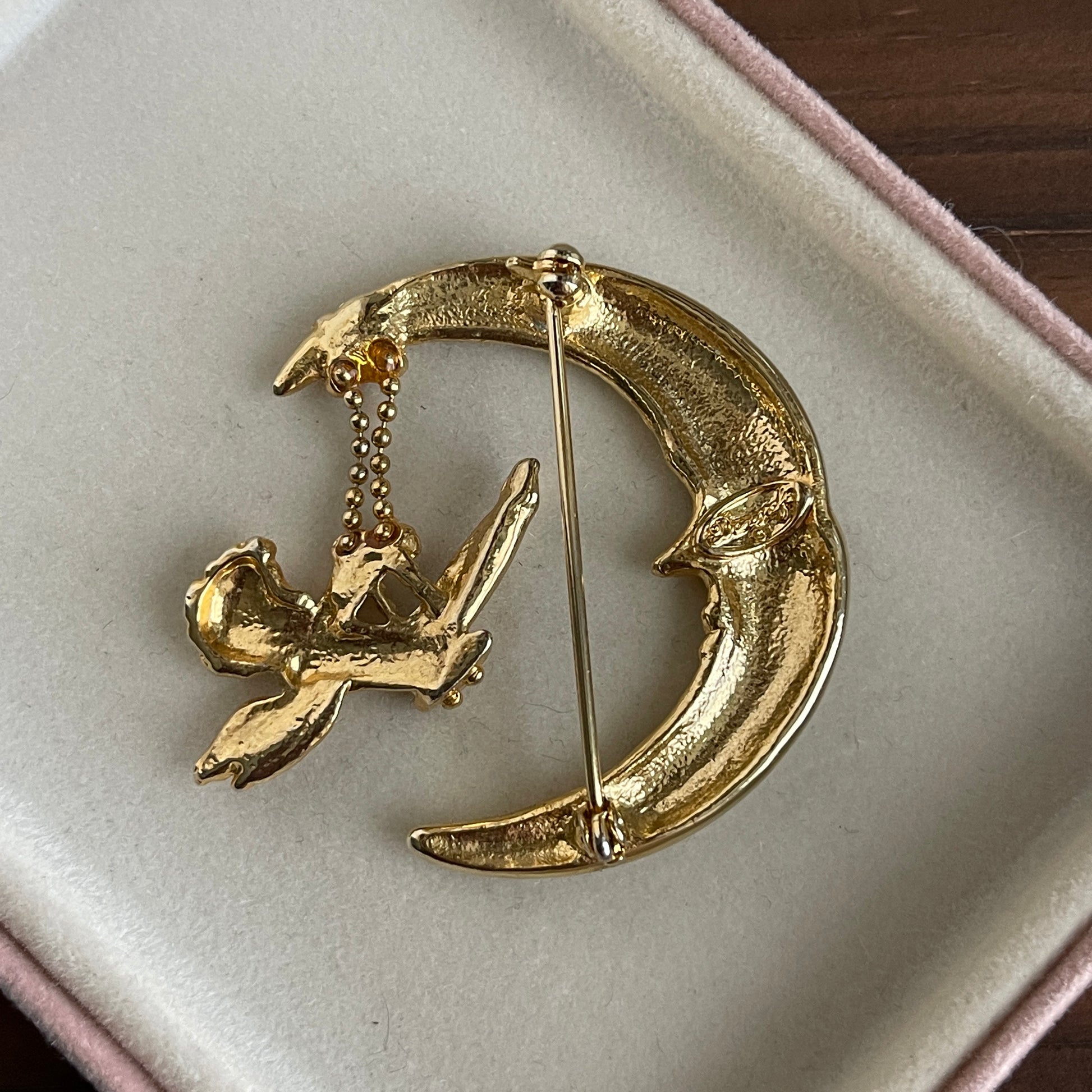 Vintage angel angel swinging from moon pin Signed Danecraft brooch