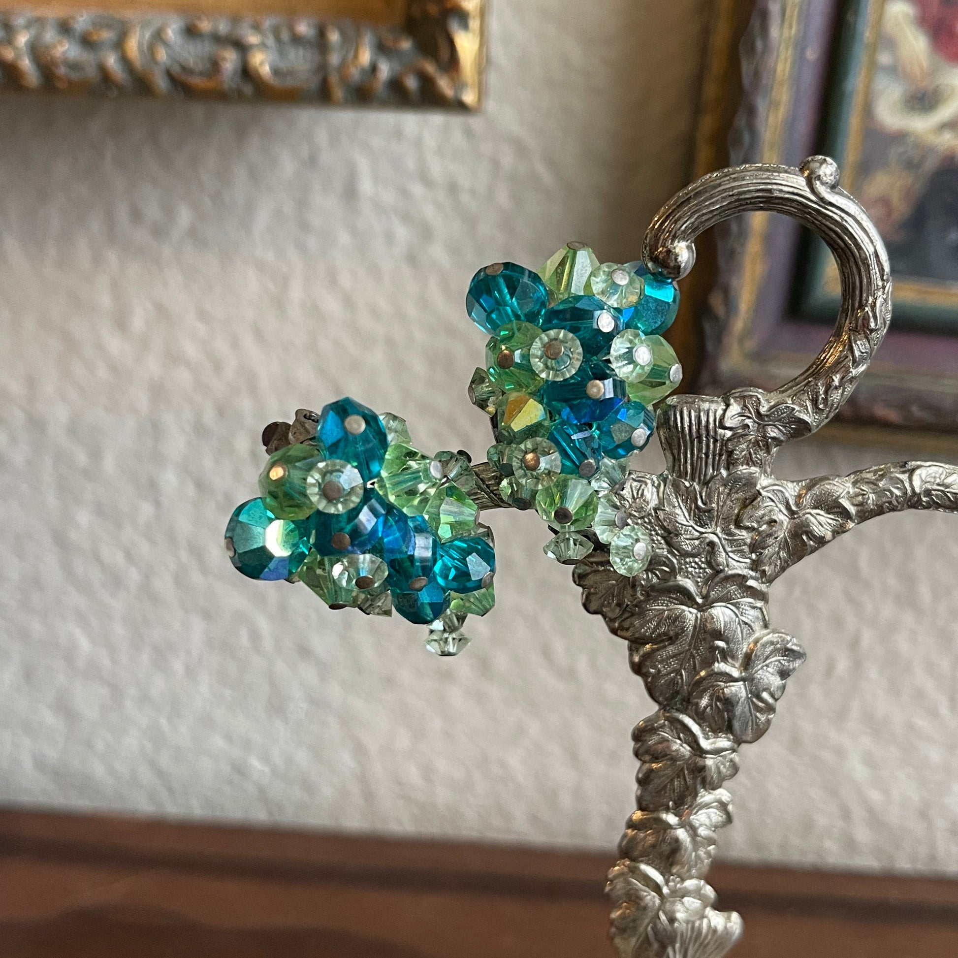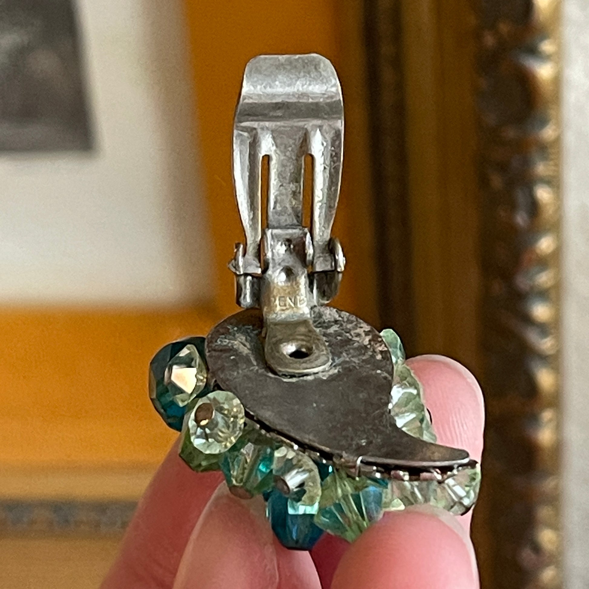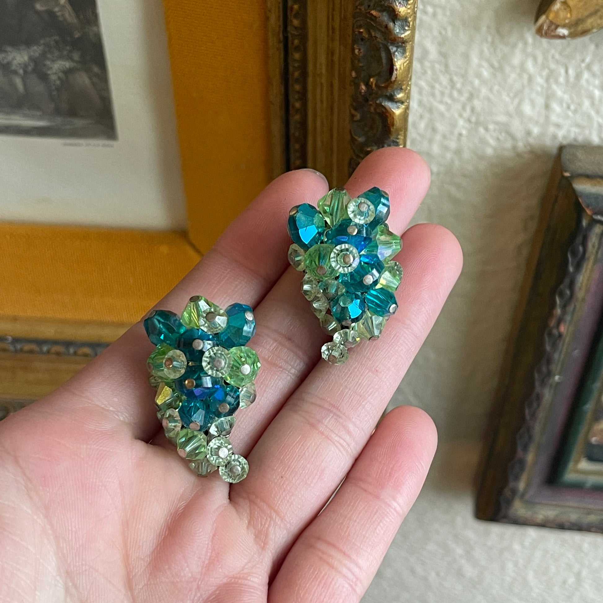 Vintage Crystal bead Cluster AB Blue Green Wrap Clip Earrings