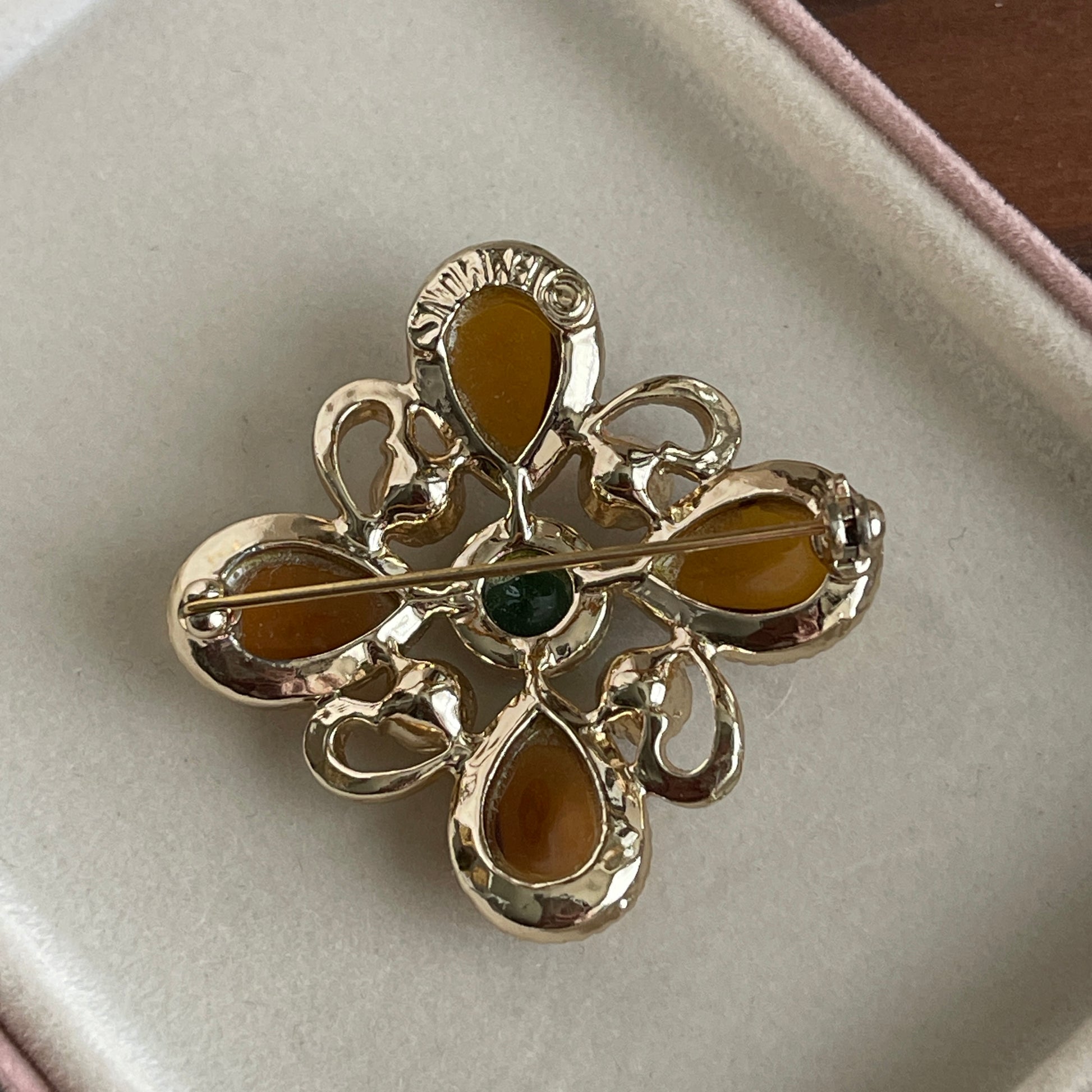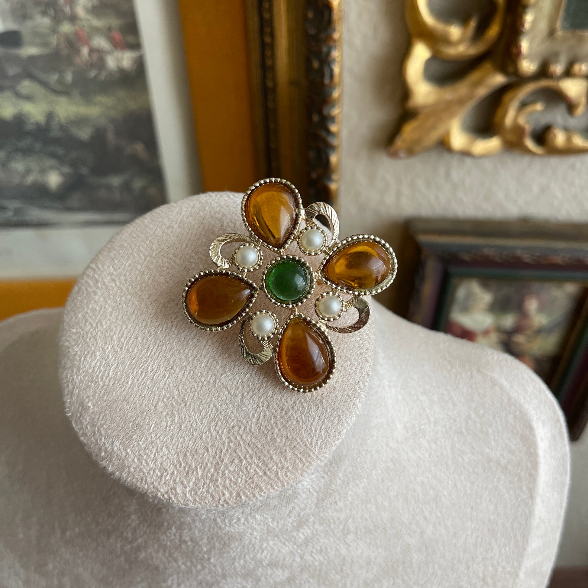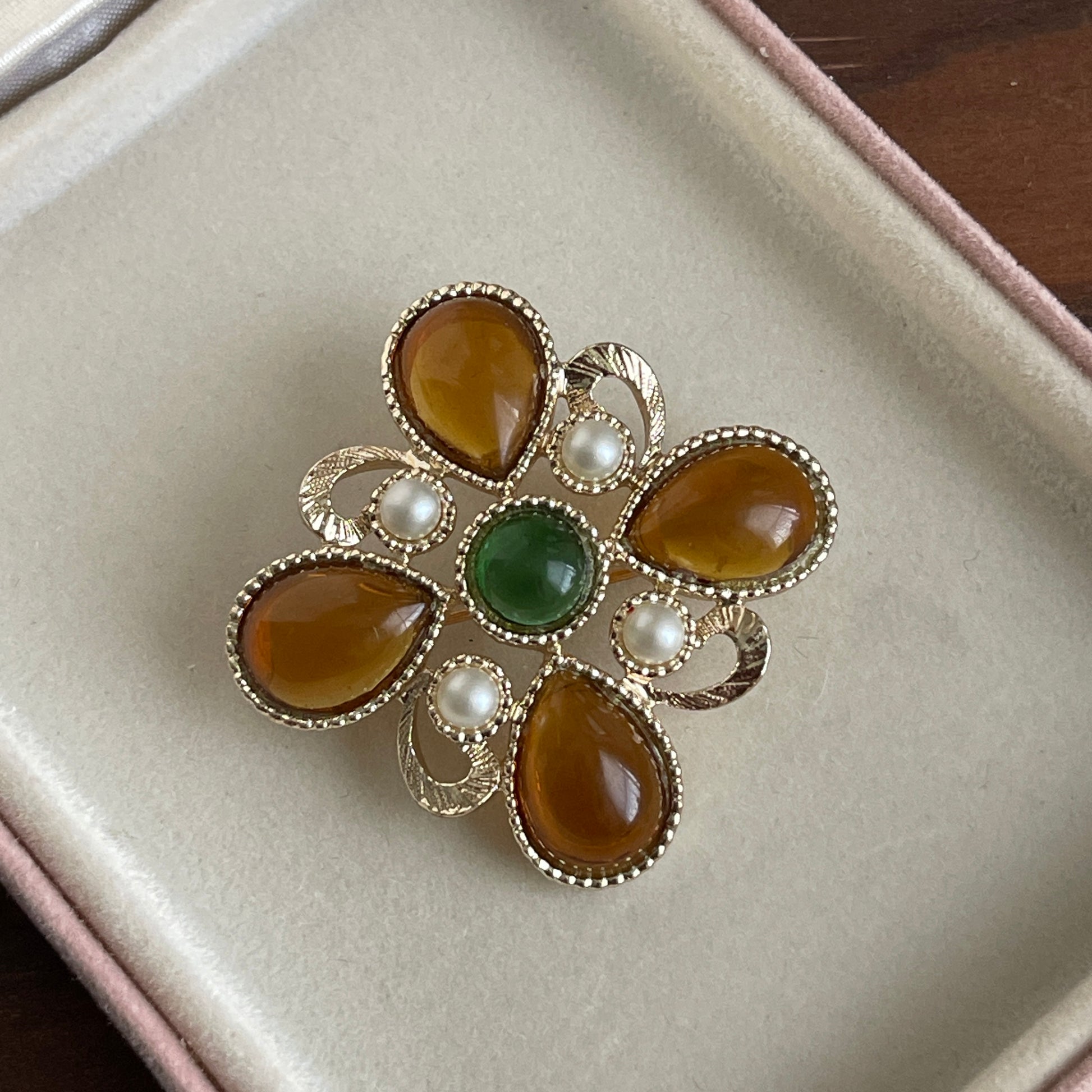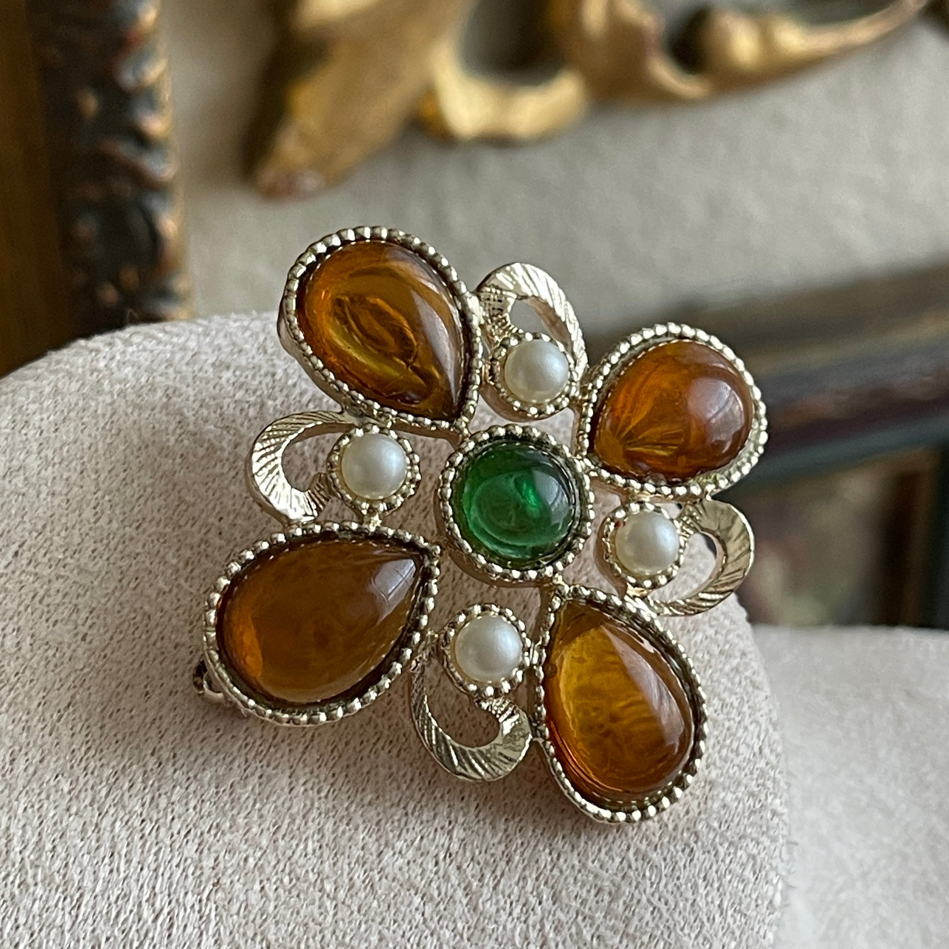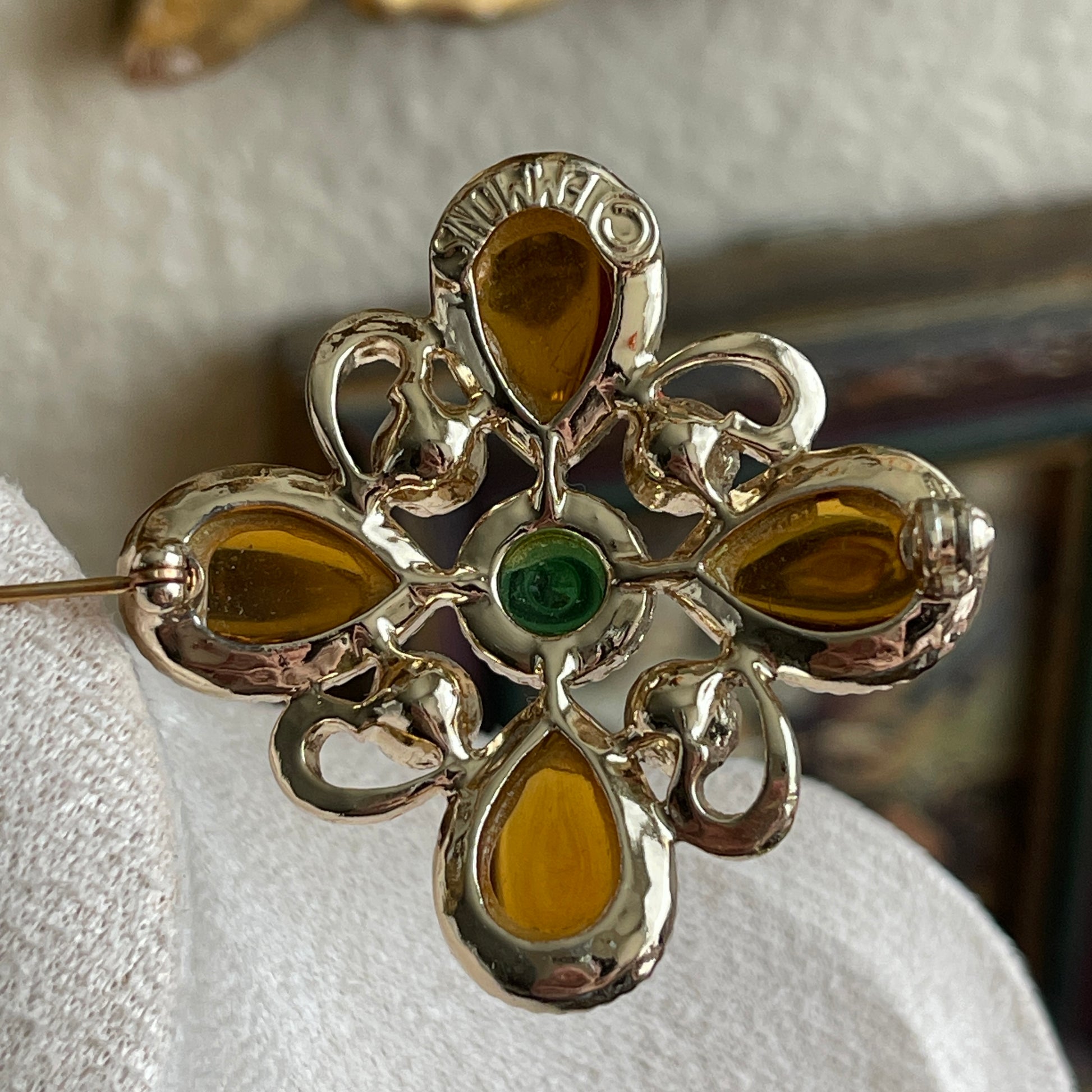 Vintage Emmons Gold Tone Maltese Cross Brooch Pin Faux Pearls Cabochon Stones
