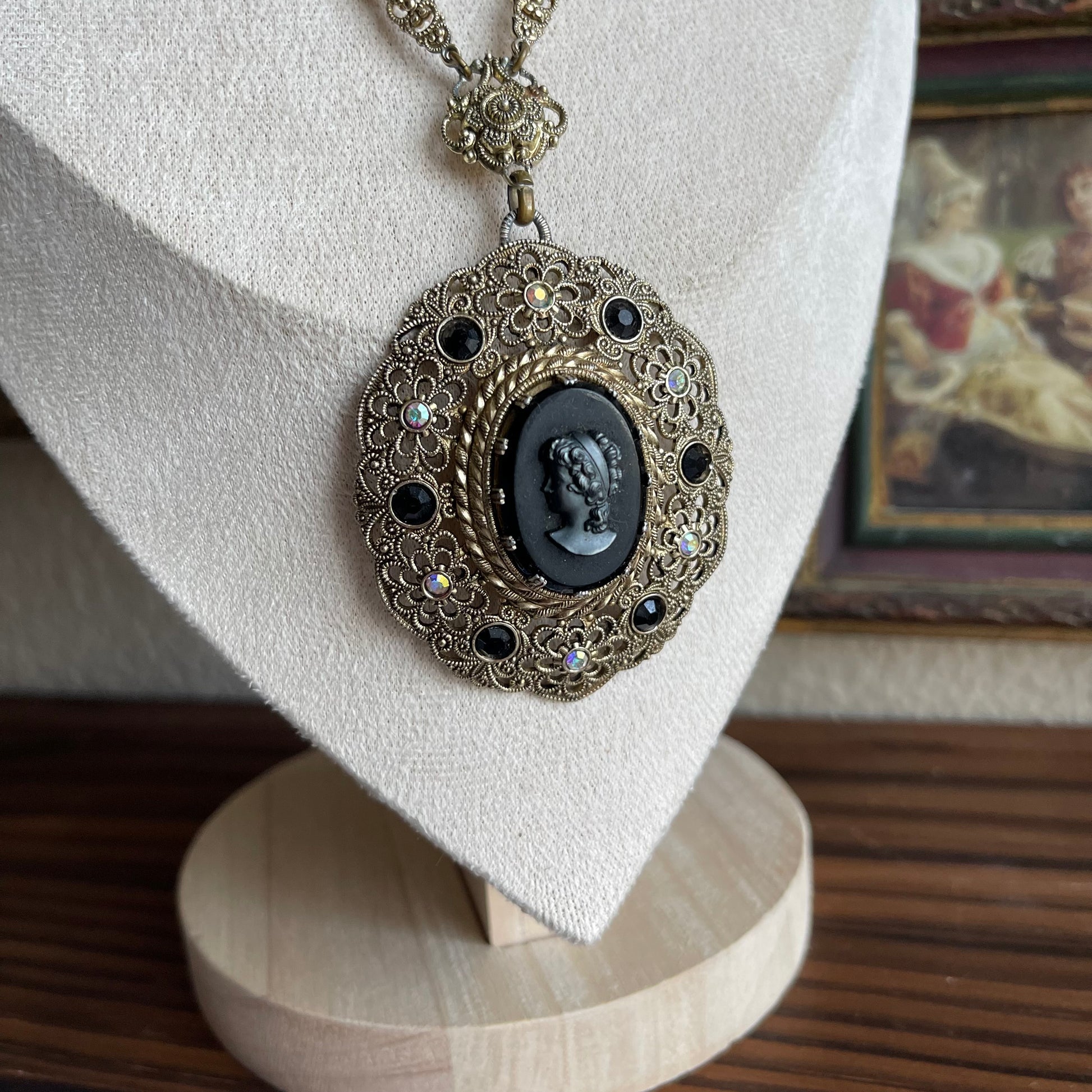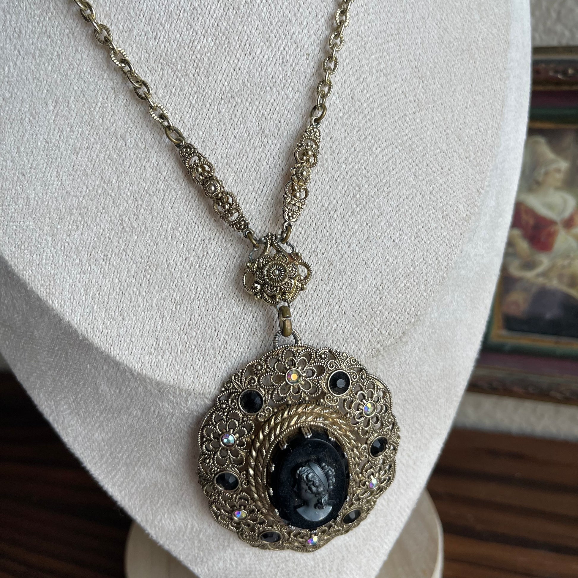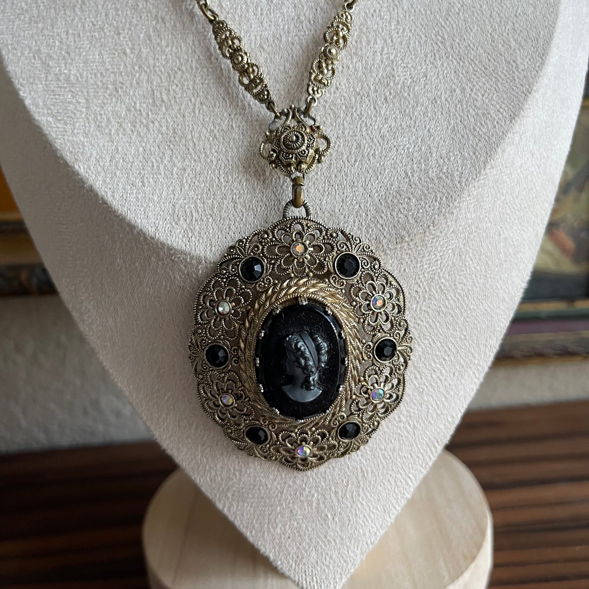 Vintage Germany Black Left Cameo Rhinestone Necklace