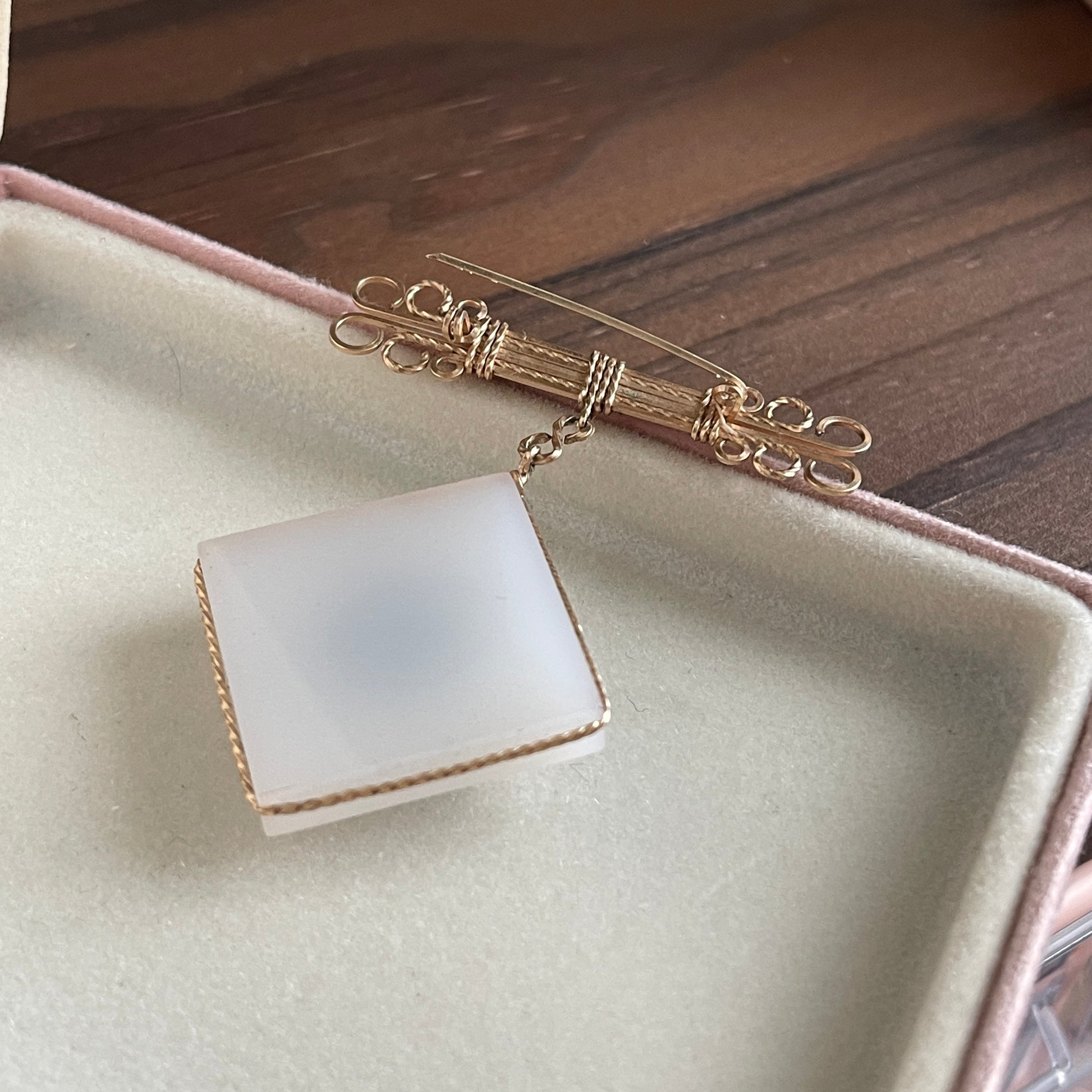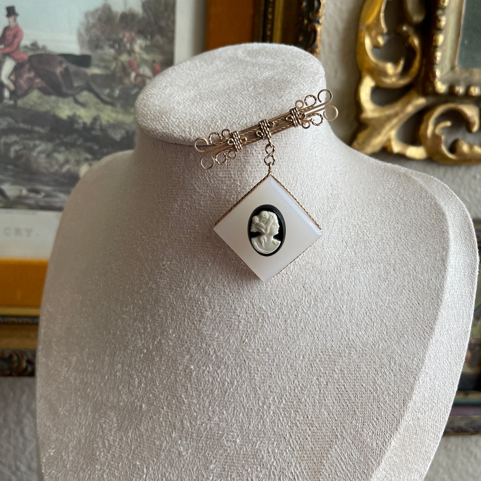 Vintage gold gilt wire dangling brooch with black and white Cameo