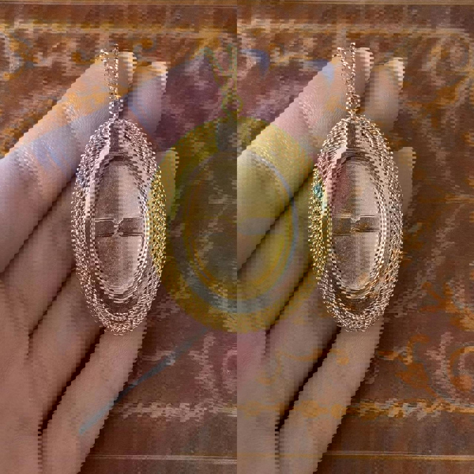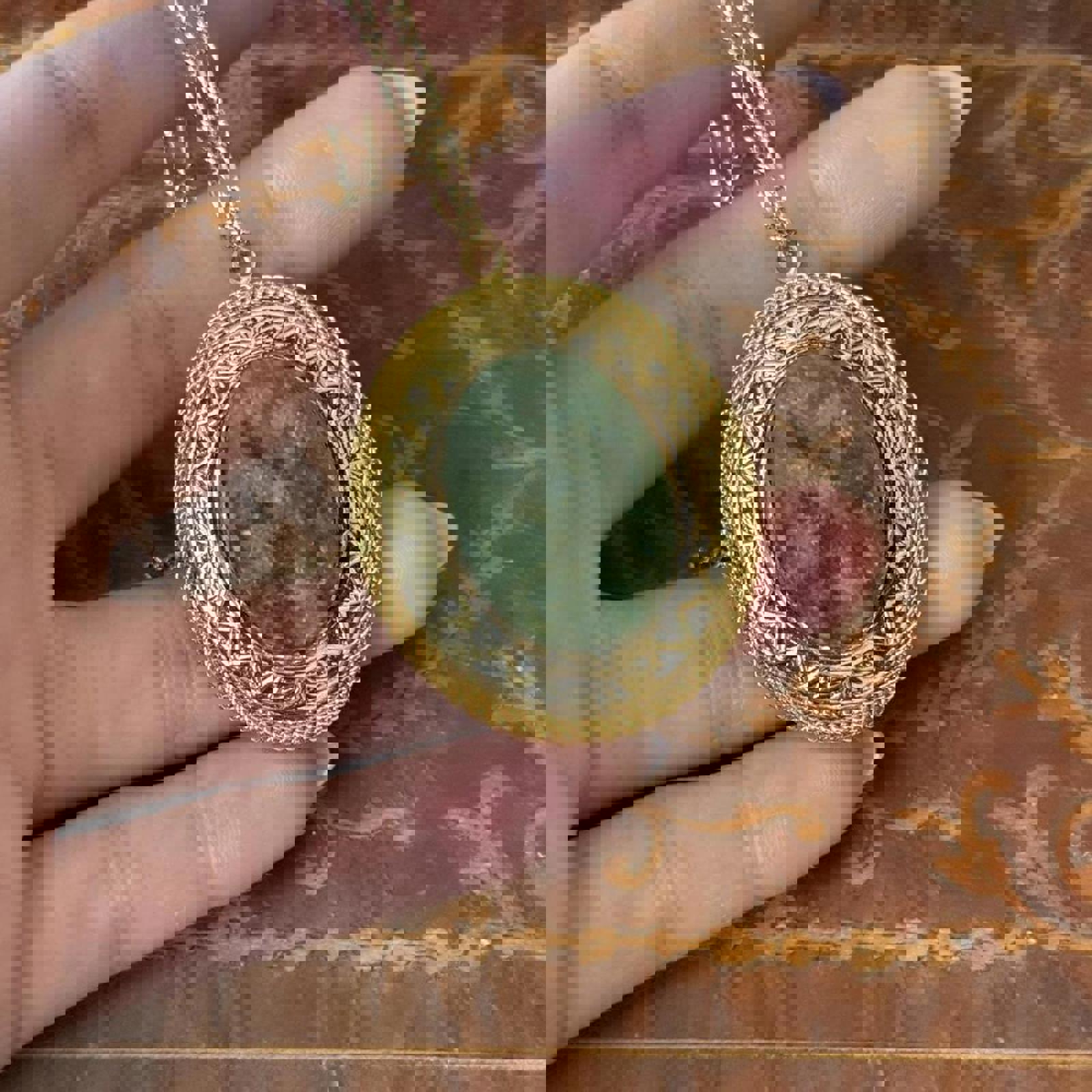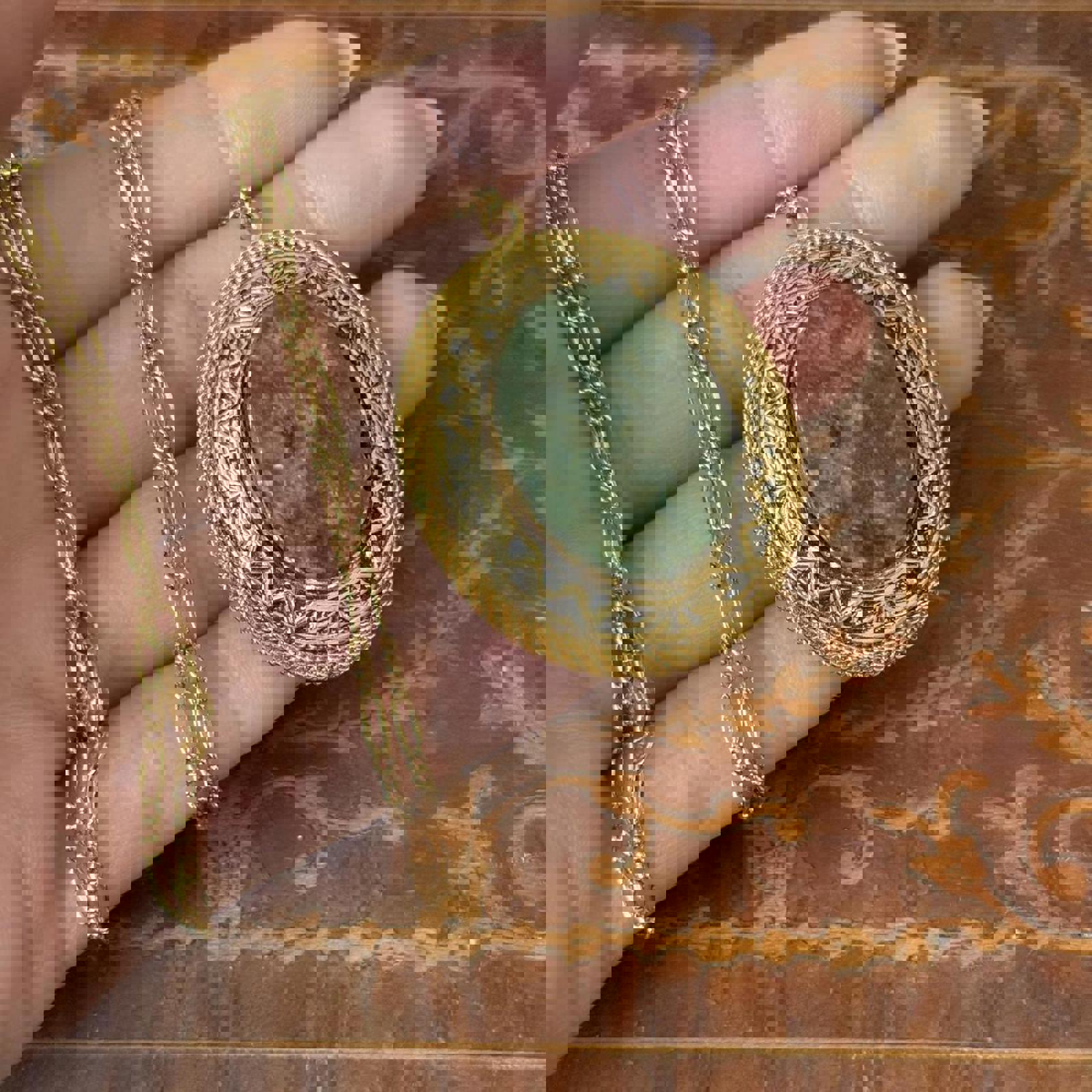 green gemstone, gold tone, statement jewelry, vintage pendant, organza necklace, ornate design, boho style, retro accessory, detailed craftsmanship, earthy tones