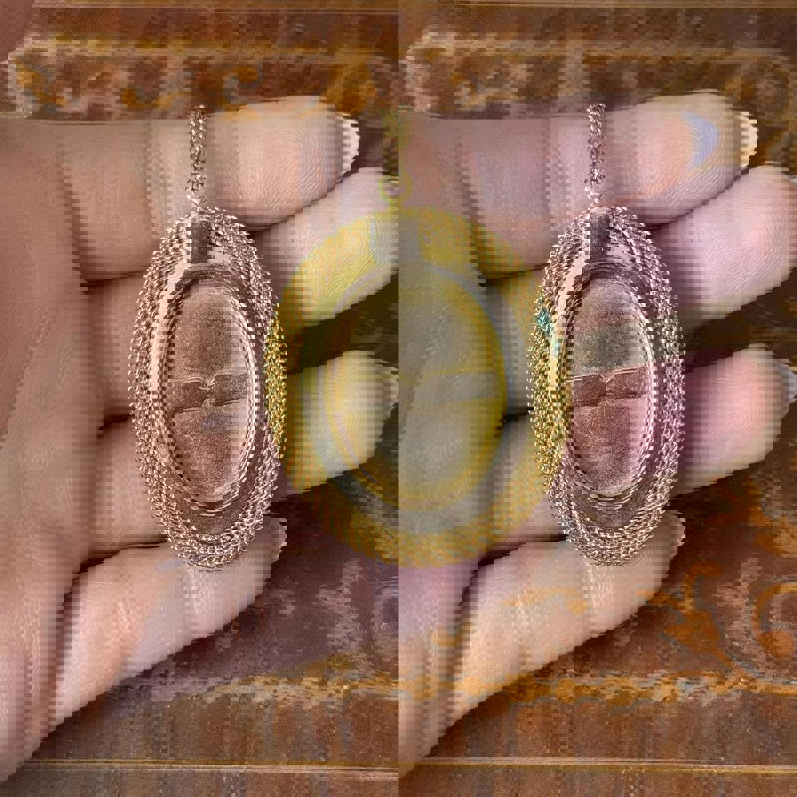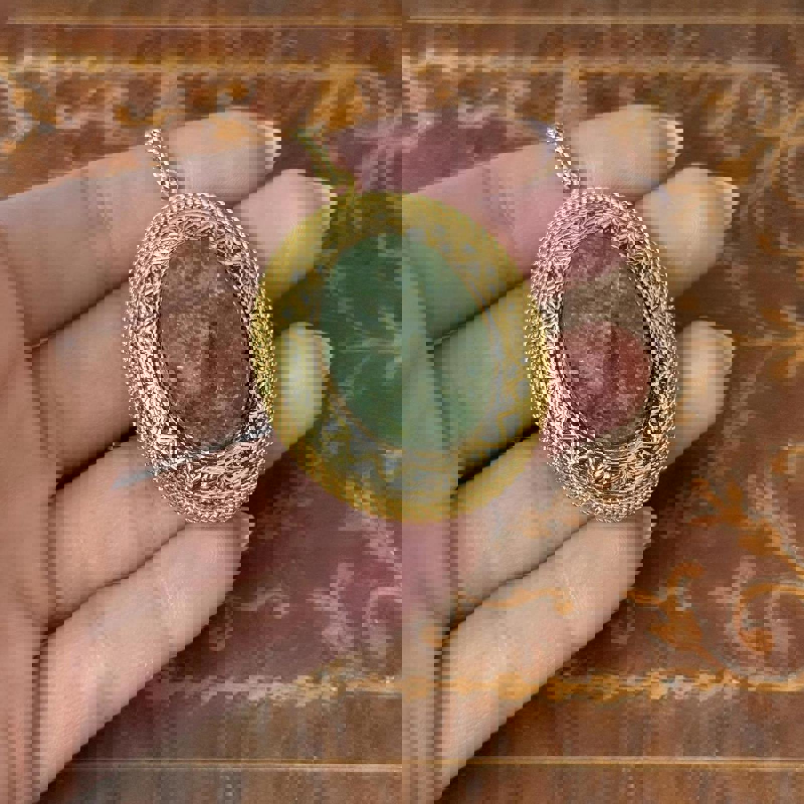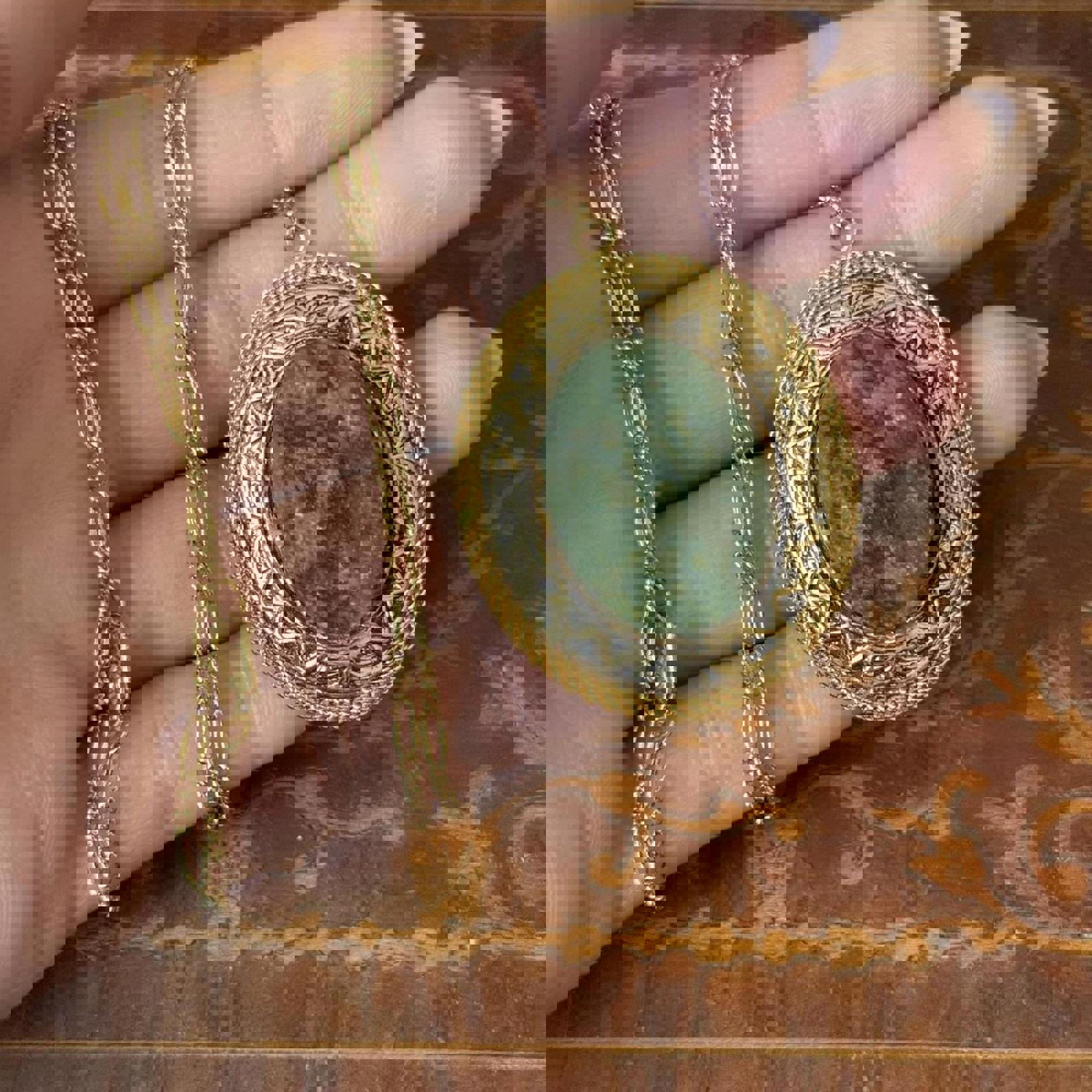 green gemstone, gold tone, statement jewelry, vintage pendant, organza necklace, ornate design, boho style, retro accessory, detailed craftsmanship, earthy tones