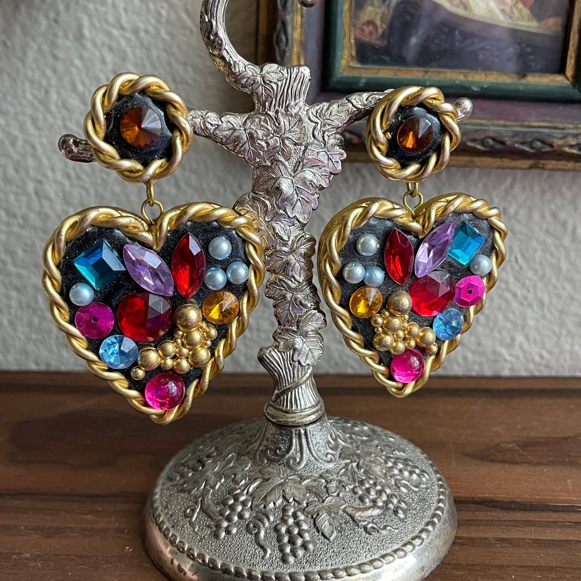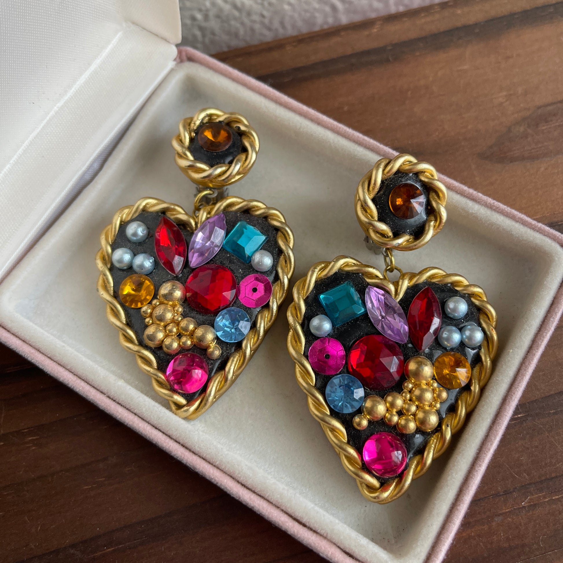 Vintage Heart earrings with multicoloured faux stones clip ons