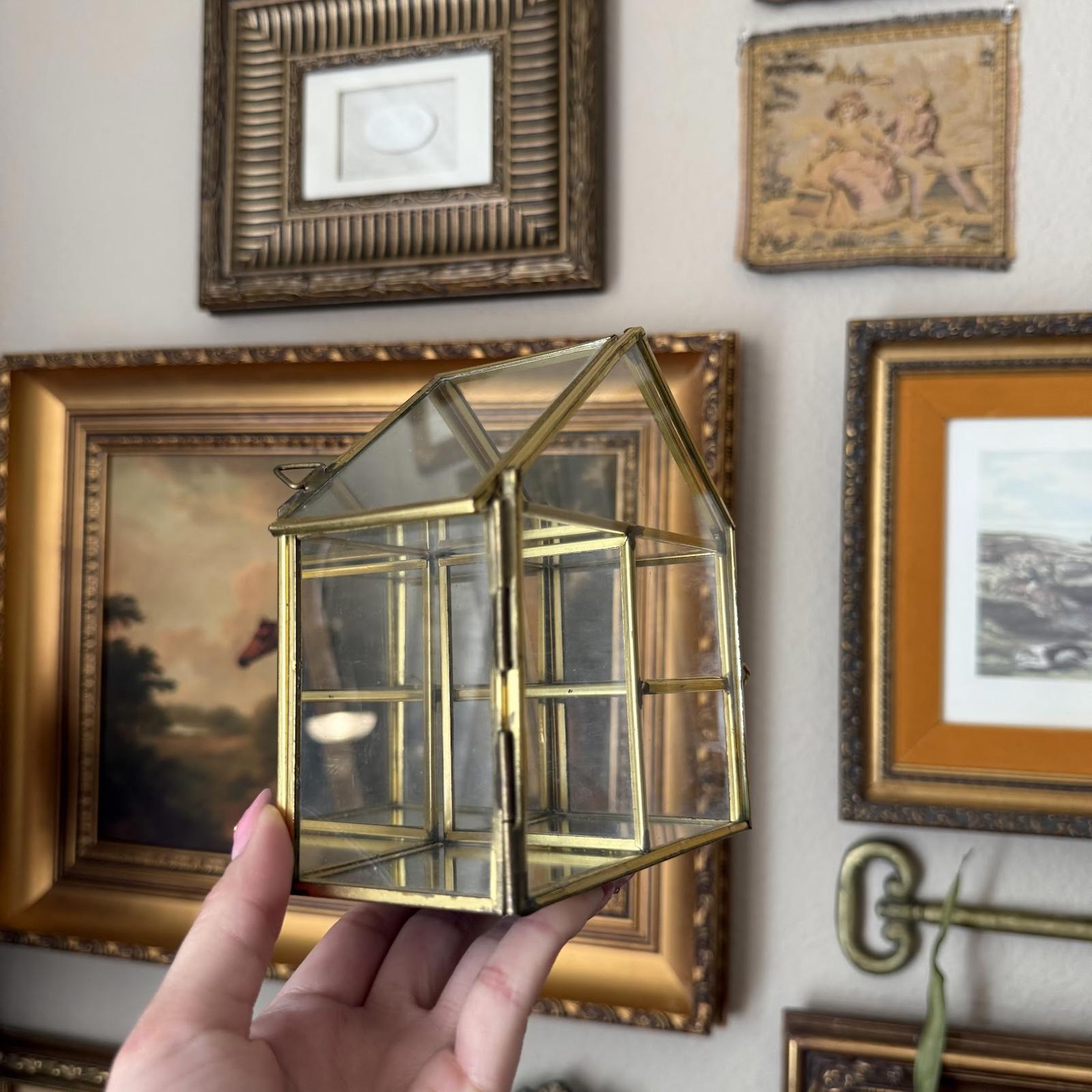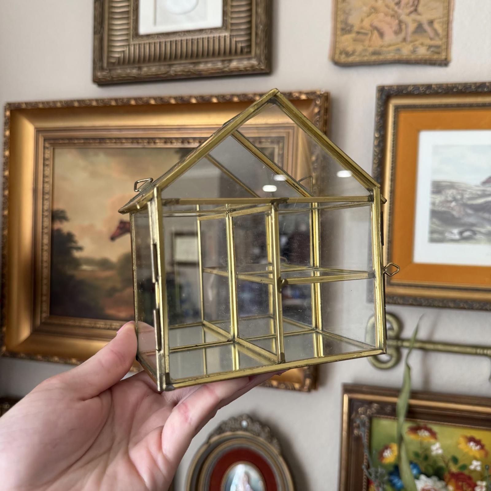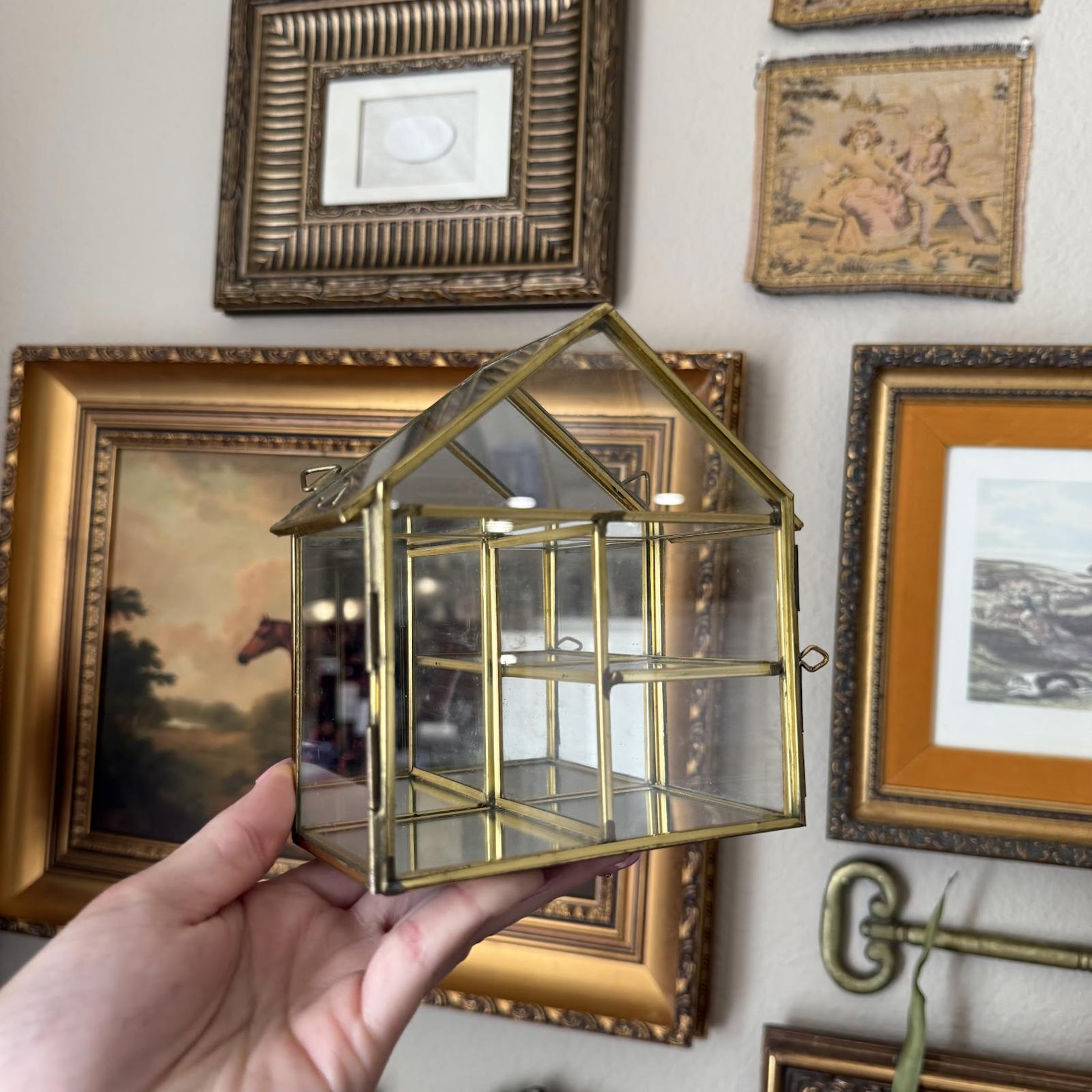 Vintage Mirrored Brass and Glass House-Shaped Display Shelf