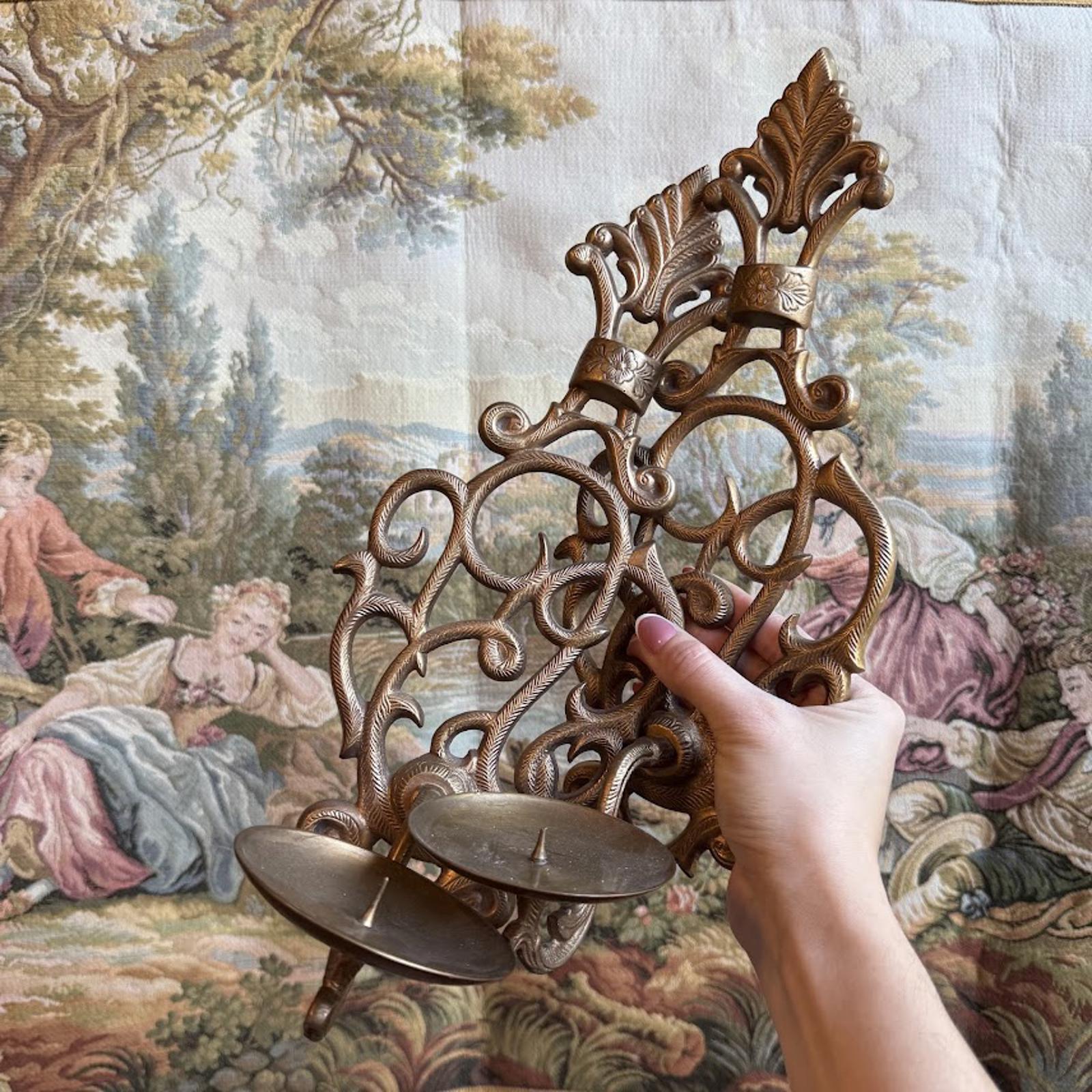 Vintage Ornate Brass Metal Wall Mounted Candle Sconce set
