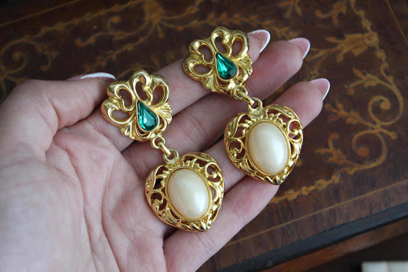 Vintage Ornate Green & Faux Pearl Gold Tone Clip on Earrings